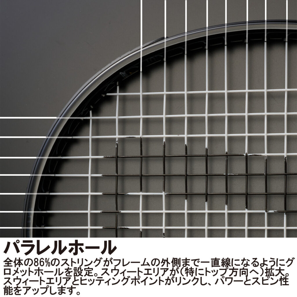 全体の86%のストリングがフレームの外側まで1直線になるようにグロメットホールを設定。スウィートエリアが(特にトップ方向へ)拡大。スウィートエリアとヒッティングポイントがリンクし、パワーとスピン性能をアップします。 パラ […]