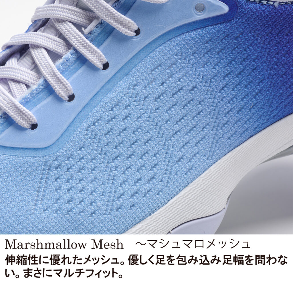 伸縮性に優れたメッシュ。優しく足を包み込んでくれる、足幅を問わない。 まさにマルチフィットが実現。