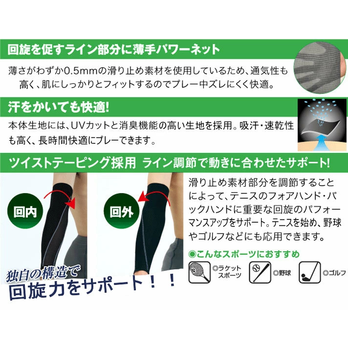 テーピングのサポートラインを応用し、ラケットを振る・ボールを投げるといった腕の回内運動を自然にサポート。正しいスウィングに導き、パフォーマンスを向上させるサポーター。