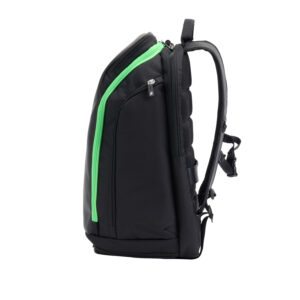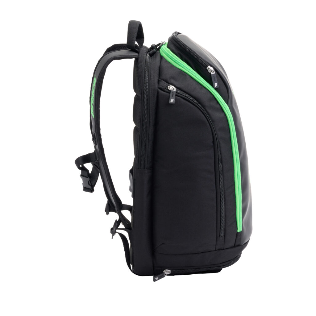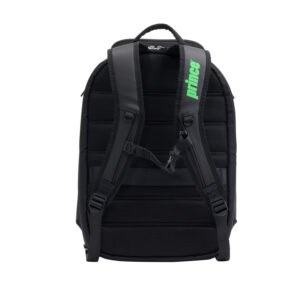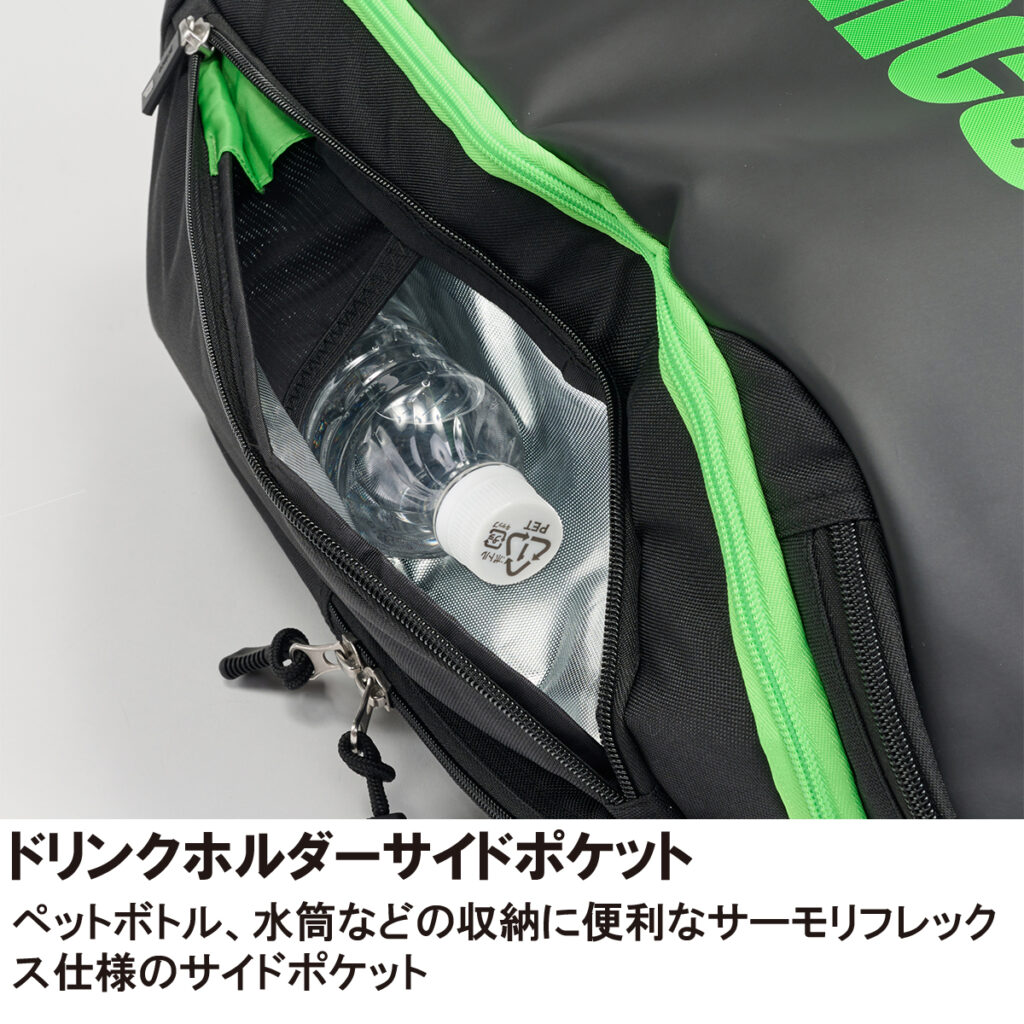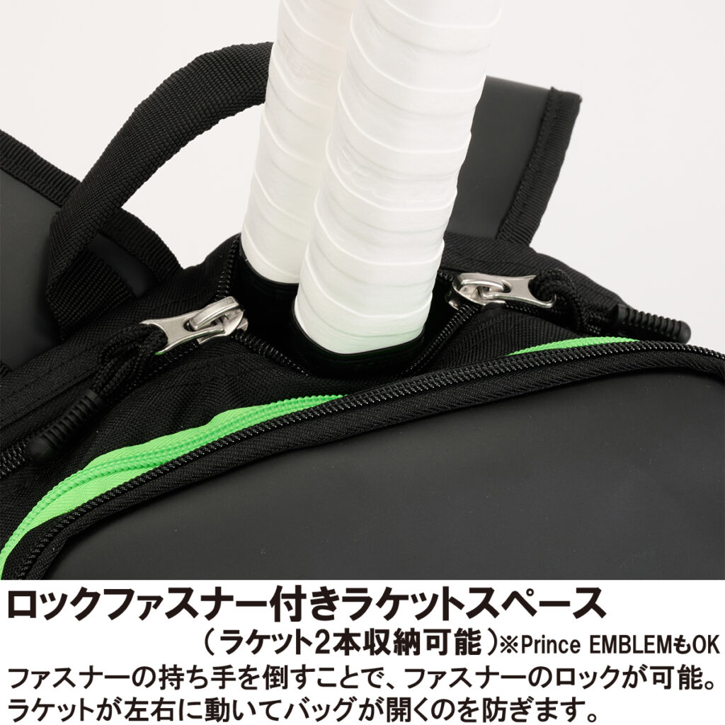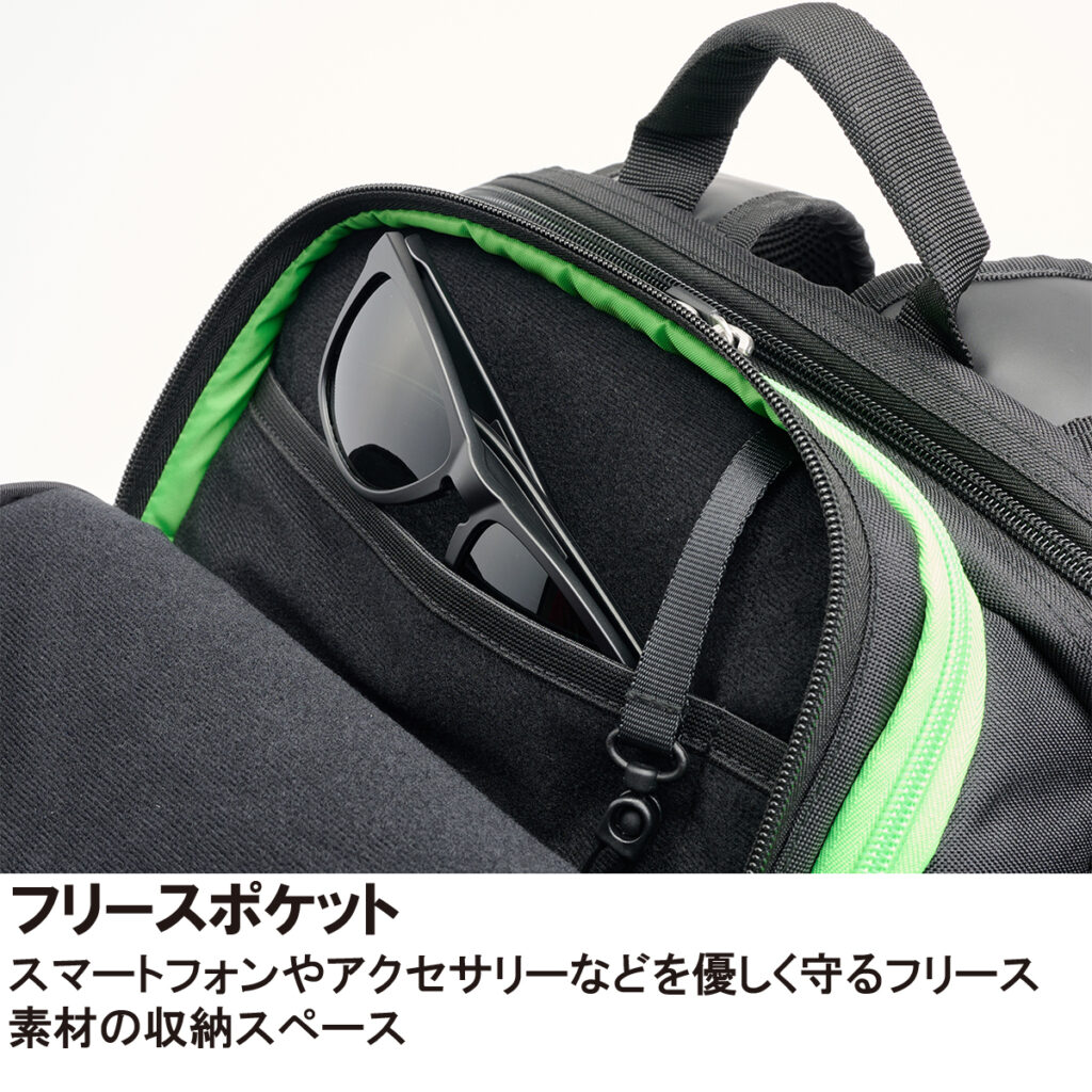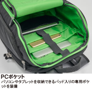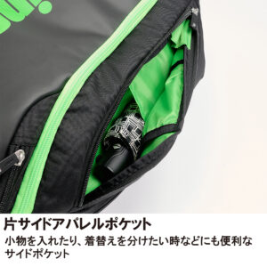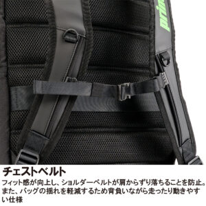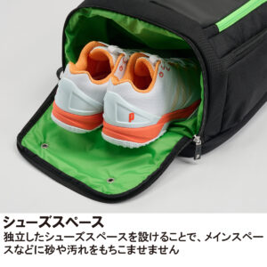 ロックファスナー付きラケットスペース、シューズスペース、PCポケット、ドリンクホルダーサイドポケット、片サイドアパレルポケット、背面メッシュパッド、チェストベルト