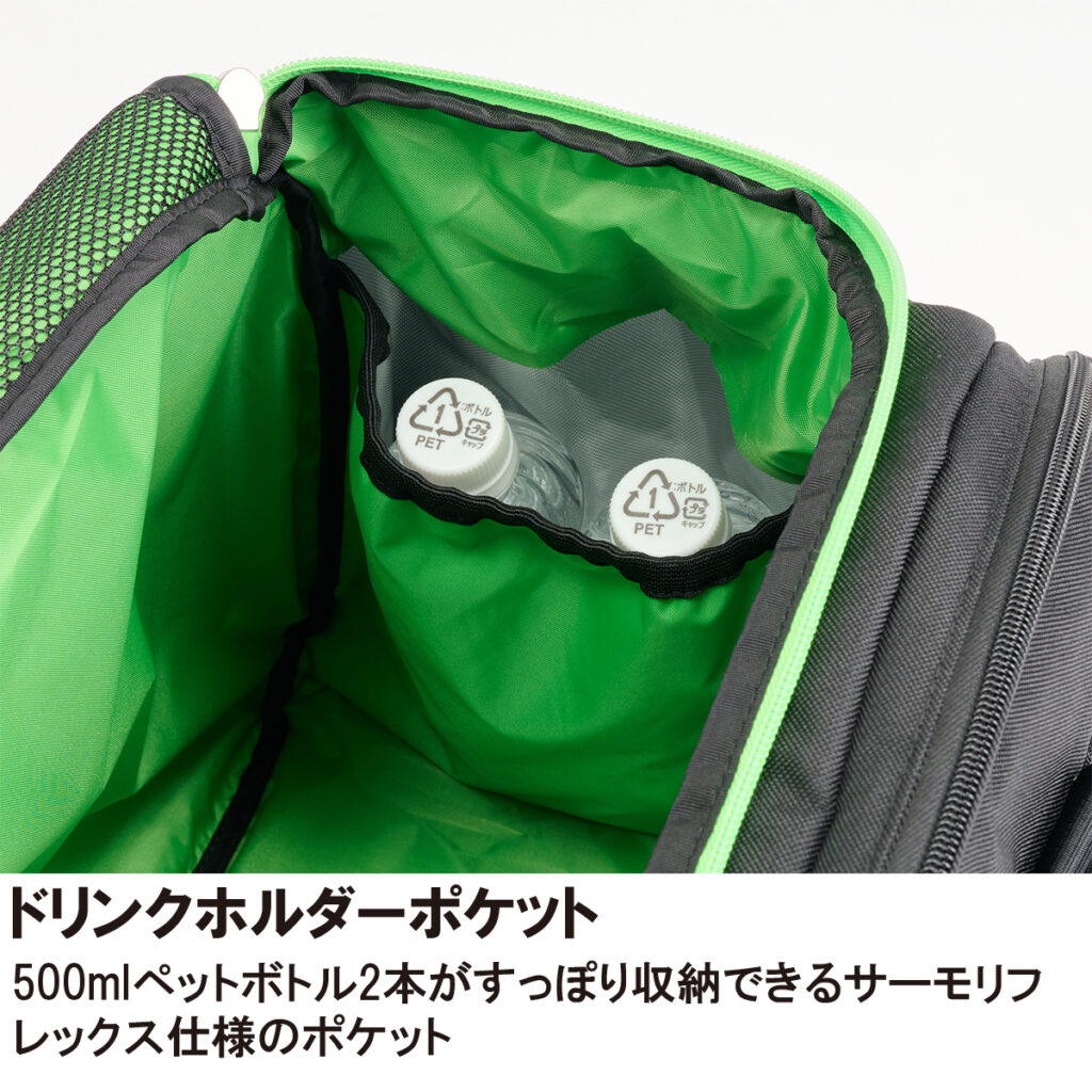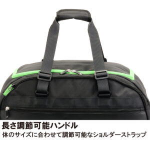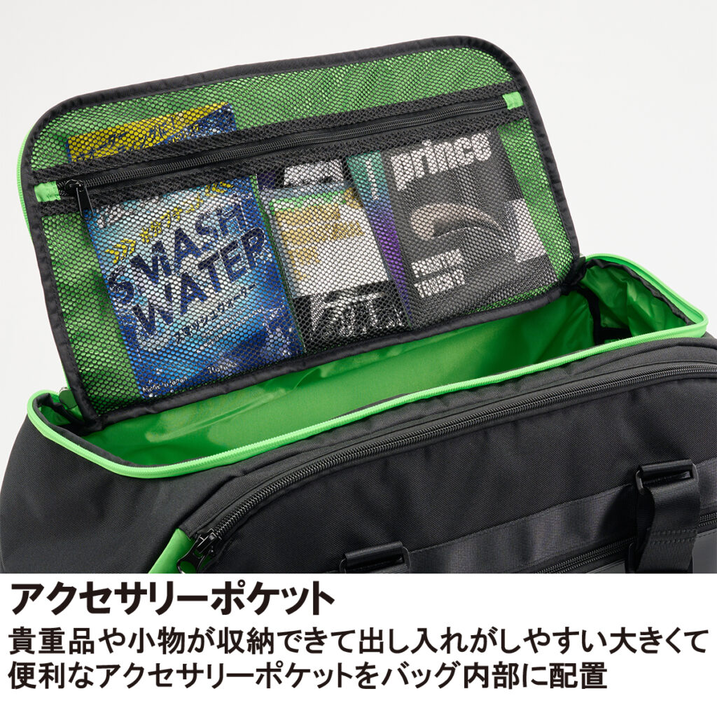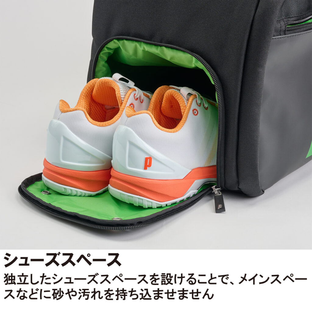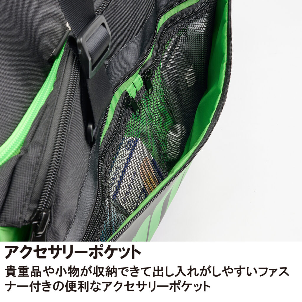 - シューズスペース、アクセサリーポケット、フリースポケット、長さ調節可能ハンドル、ロックファスナー、ラケットスペース、ドリンクホルダーポケット