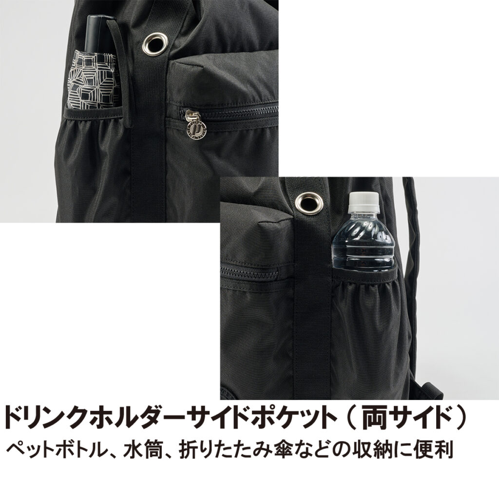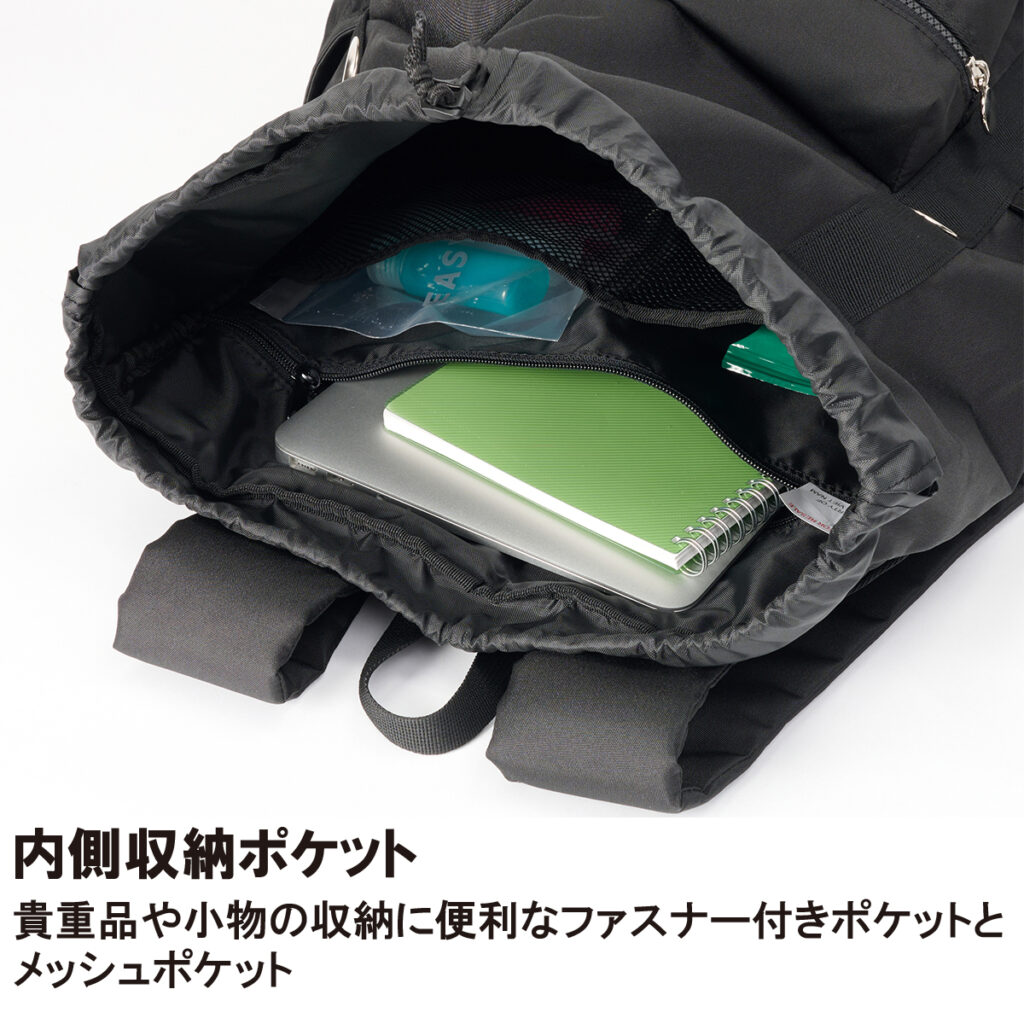 洗練されたオールブラックで統一されたスタイリッシュなデザインが特徴。シーズンを問わない汎用性の高いバックパック